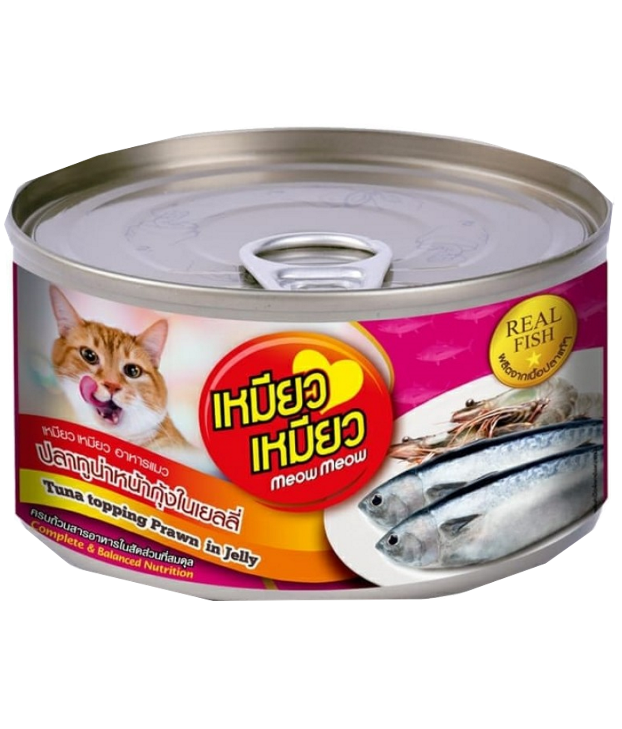 Meow Meow Cat Can Tuna Topping Prawn in Jelly is For cat over 6 months old. Made from well-selected tuna which bring out great aroma and delicious taste. Complete and balanced nutrition. No reformed meat and no preservative. Fish oil support immune system and nourish brain. Vitamin E nourish hair and skin. Taurine support eyesight.